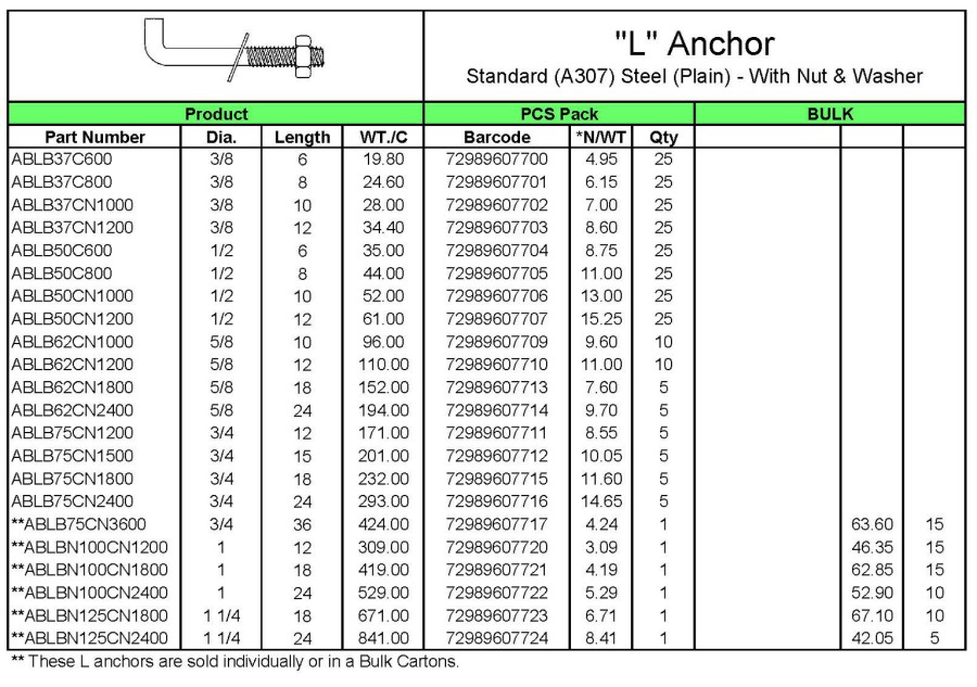 - "L" Anchors w/Nut & Washer Plain