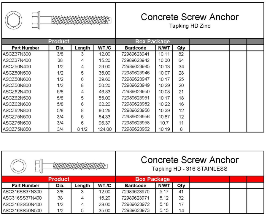 - Concrete Anchor Screws Zinc + SS