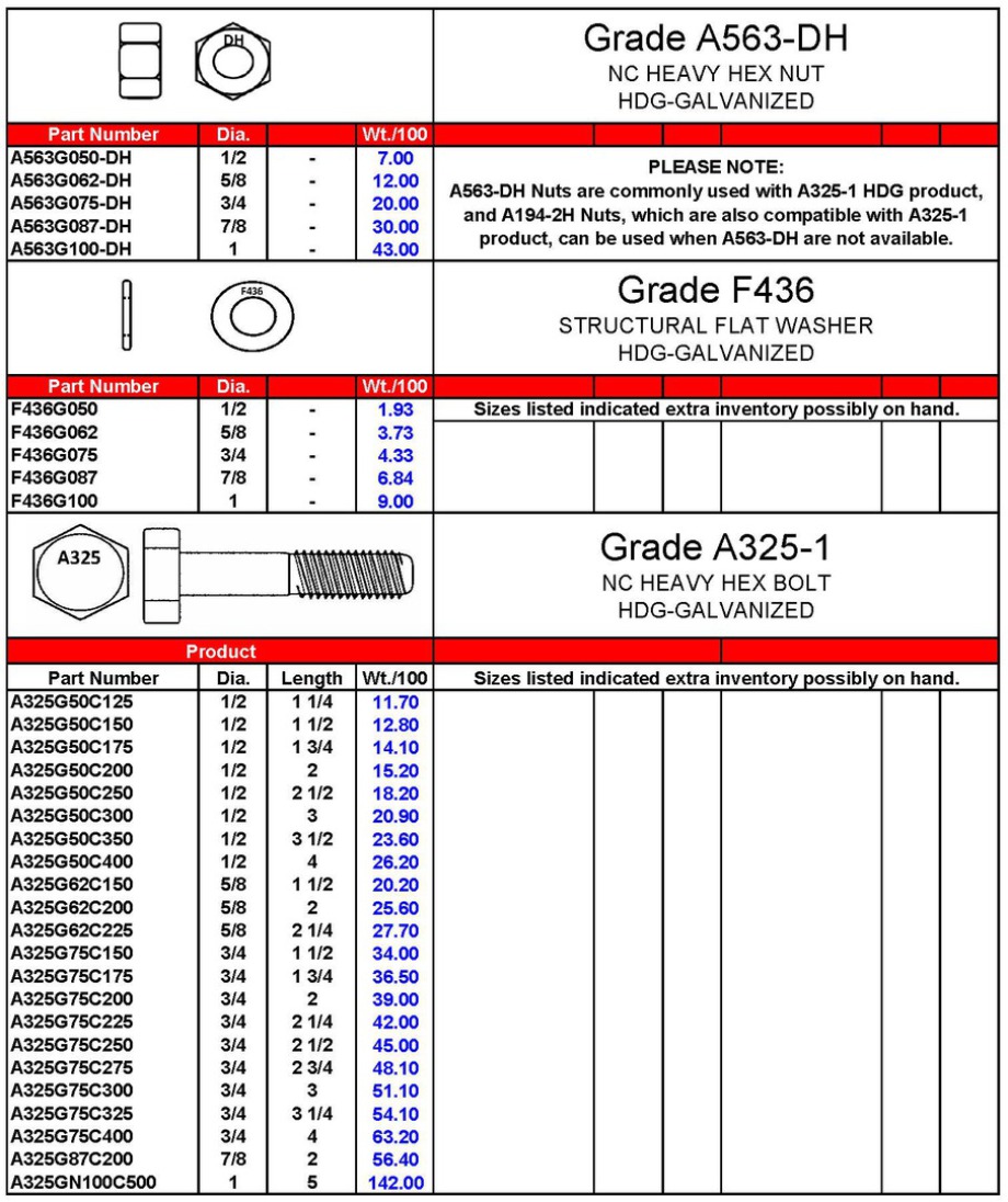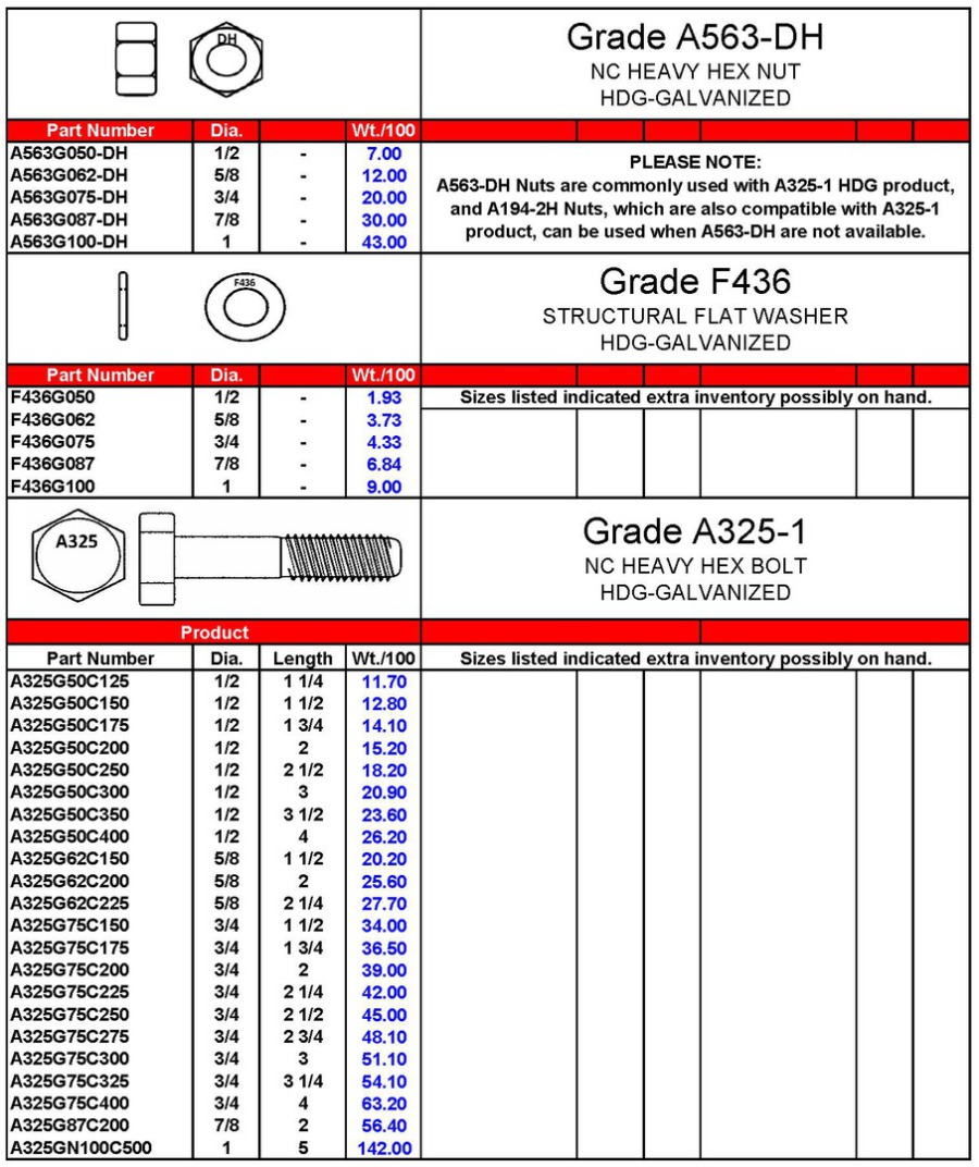 As it is with A193-B7 Bolts and A194-2H Nuts, we have also begun to stock A325 Bolts, A563 Nuts, & F436 Flats of the sizes we've sold. Again, customers are buying specific pcs.,so we bring in full Kegs of the sizes purchased and keep the excess pcs. a customer doesn't need. Items in the Cataloging below which have part numbers in bold are items we've brought in and we may have some minimal stock remaining from what we've already sold.
