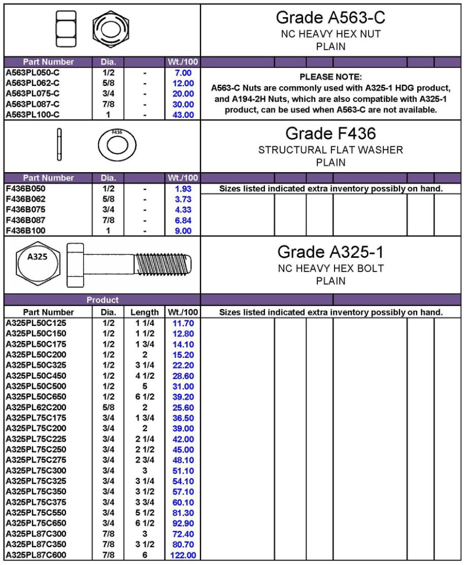 As it is with A193-B7 Bolts and A194-2H Nuts, we have also begun to stock A325 Bolts, A563 Nuts, & F436 Flats of the sizes we've sold.  Again, customers are buying specific pcs.,so we bring in full Kegs of the sizes purchased and keep the excess pcs. a customer doesn't need. Items in the Cataloging below which have part numbers in bold are items we've brought in and we may have some minimal stock remaining from what we've already sold.