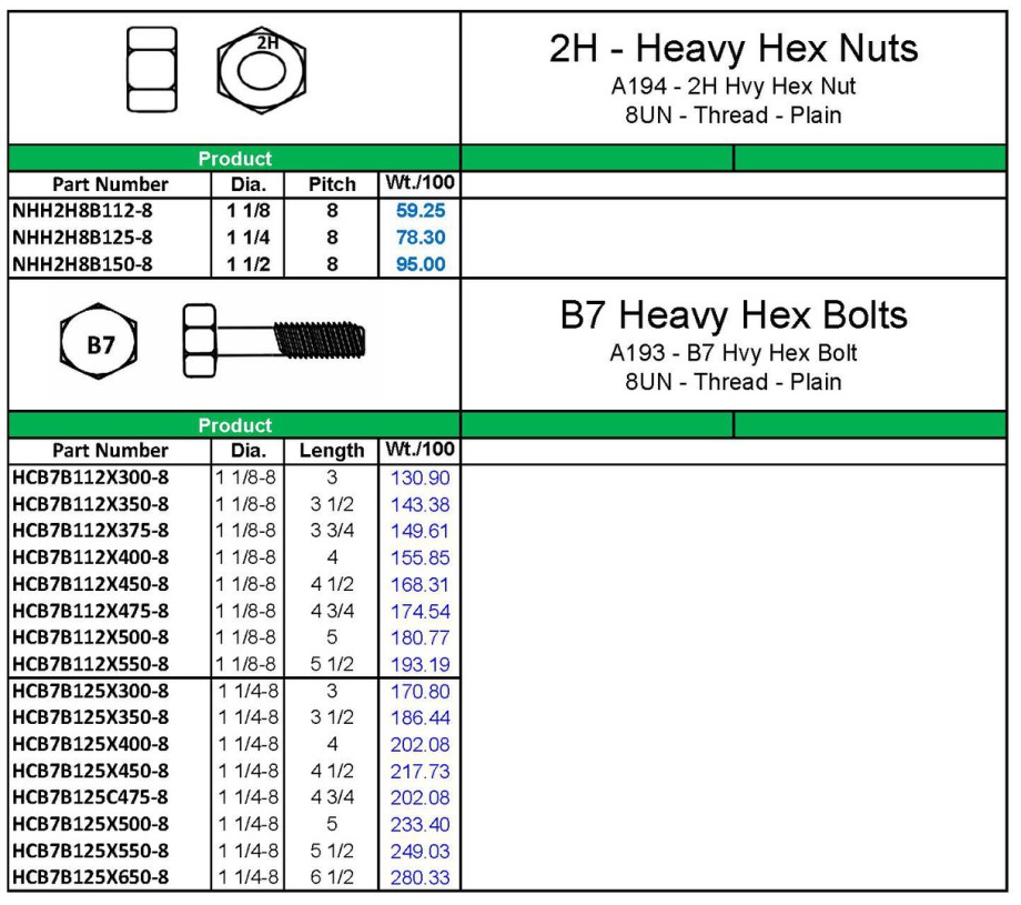 A193-B7 HEAVY BOLTS - A194-2H HEAVY NUTS---8UN THREAD - SPECIFIC TO PIPE FLANGE SPECS