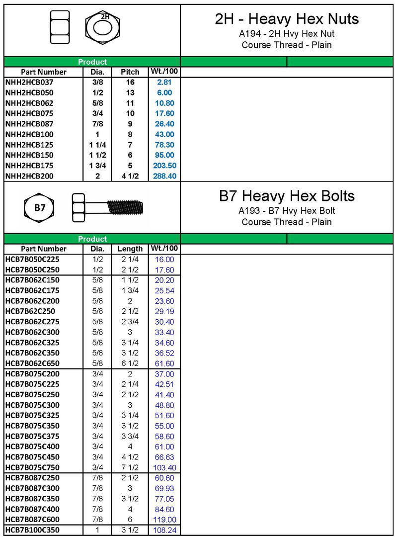 Since we've had calls for A193-B7 Bolts and A194-2H Nuts, we have begun to stock sizes we've sold. In most cases customers are buying specific pcs.,so we bring in full Kegs of the sizes purchased and keep the excess pcs. a customer doesn't need. Items in the Cataloging below which have part numbers in bold are items we've brought in and we may have some minimal stock remaining from what we've already sold.