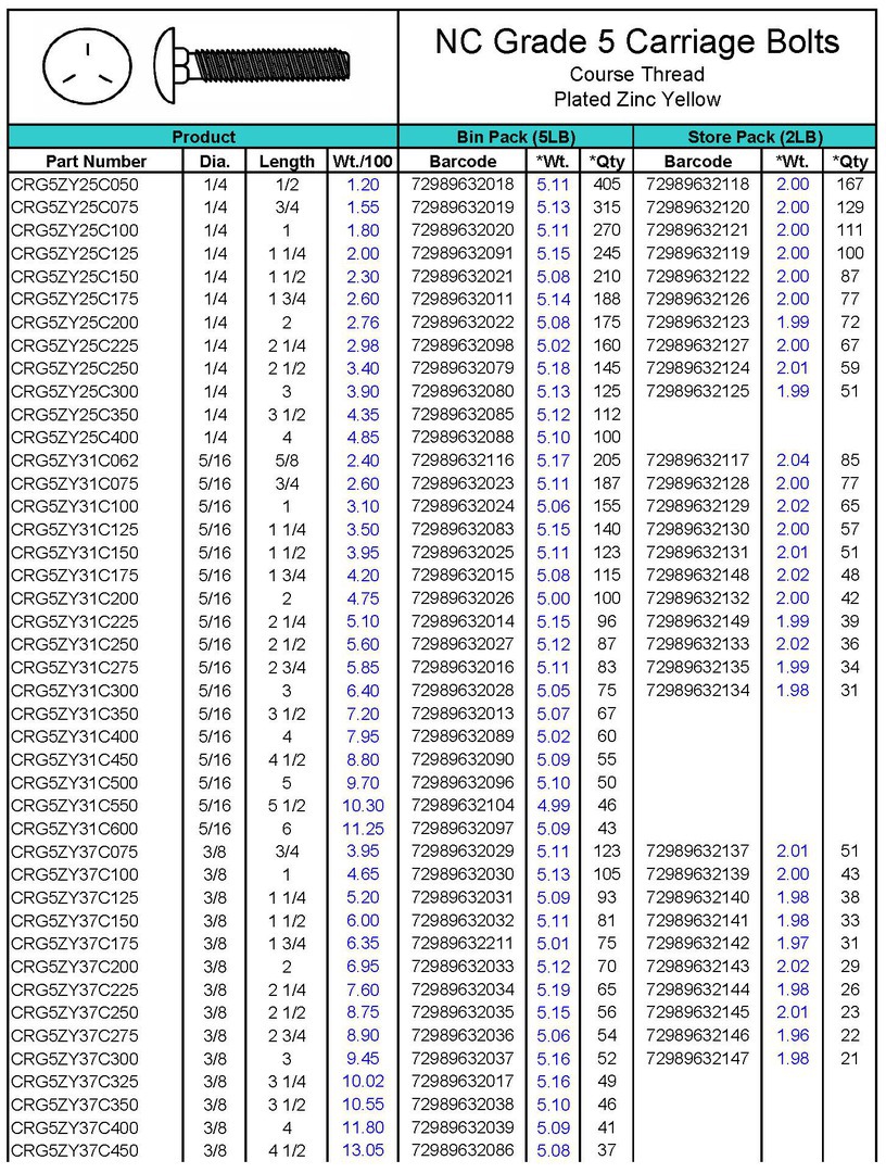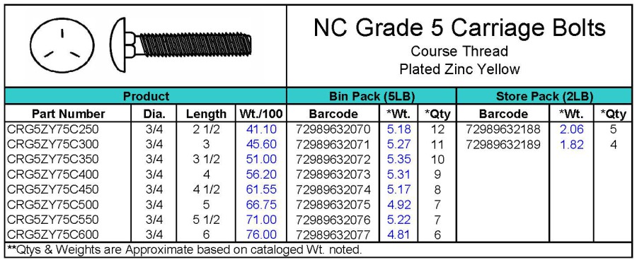 NC - Grade 5 Carriage Bolts - Zinc Yellow