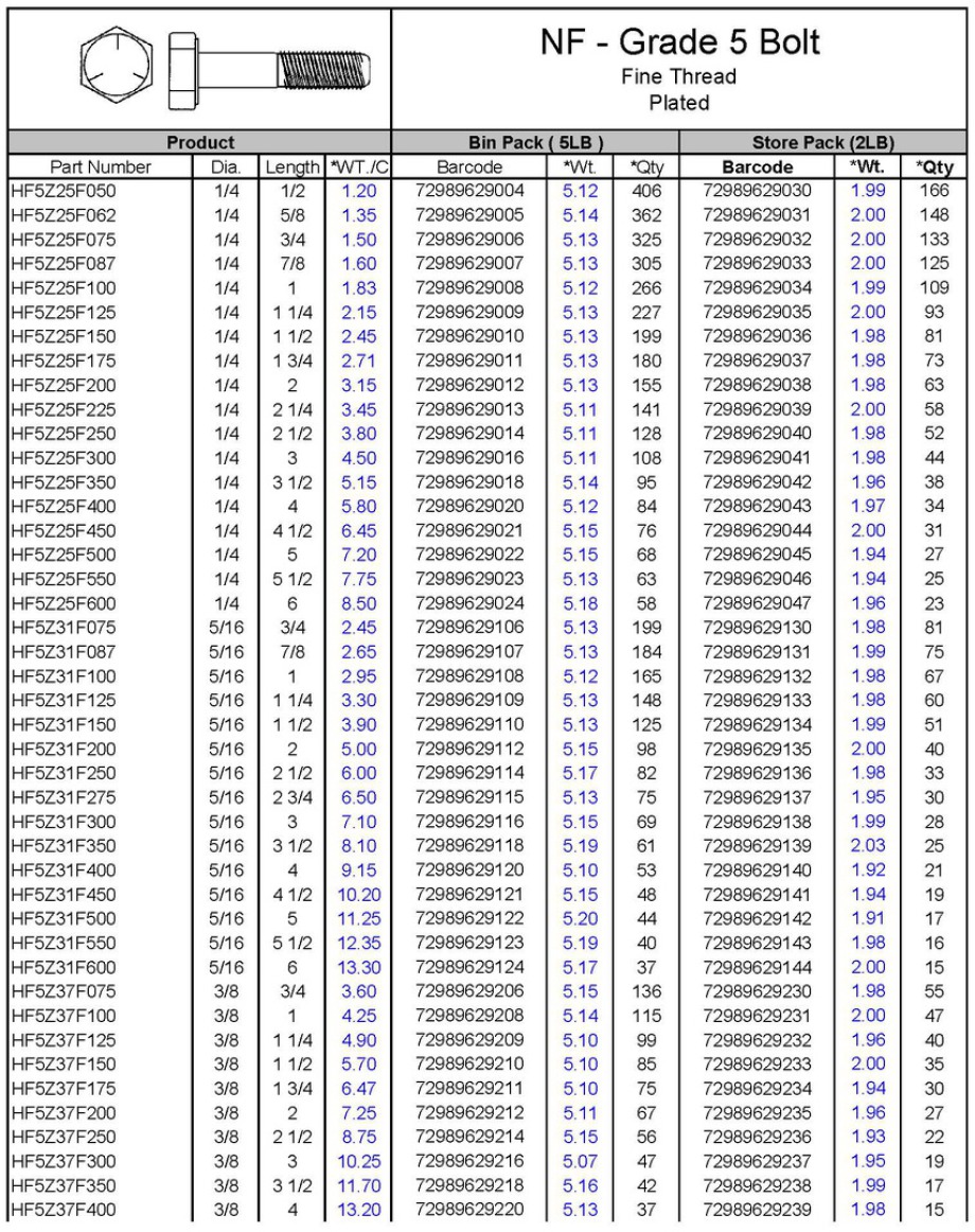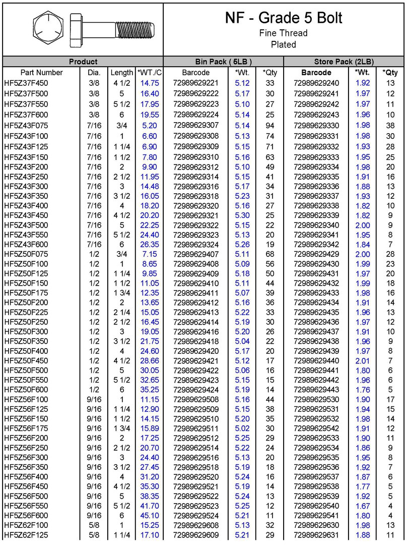 NF - Grade 5 Hex Bolts - Zinc